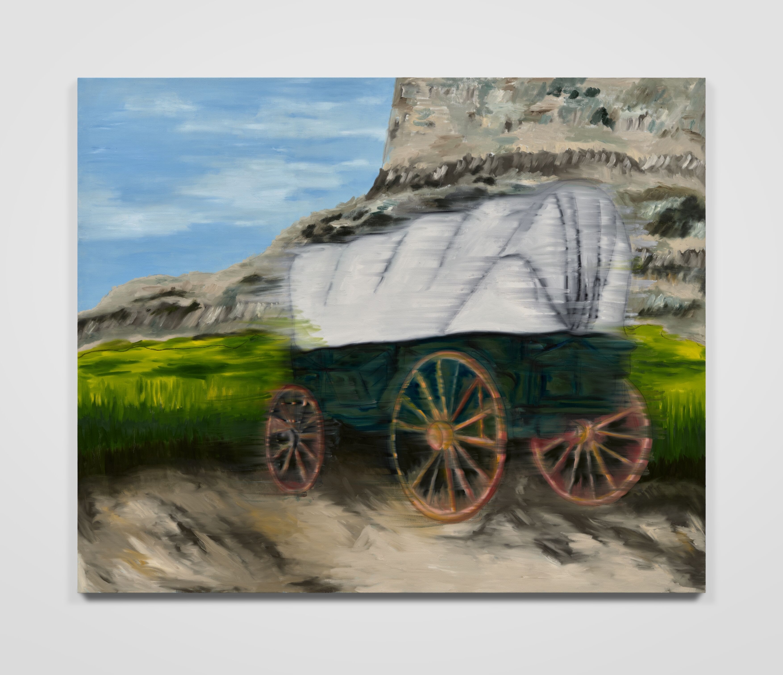 With Rush, Simmons enters into dialogue with Colorado’s history. Invoking its role as a corridor to the West, he engages the American trope of Manifest Destiny and westward expansion. The exhibition title nods to Charlie Chaplin’s film The Gold Rush—reflecting how American mythology has long nurtured ideals of urgency, hope, success, and expansion—while centering on two persistent symbols of the American frontier: the cabin and the covered wagon, drawn from both the Donner Party and Chaplin. Transforming the main gallery into a vast blackboard, Simmons immerses visitors in an environment that surrounds them like a cinema. Rush also alludes to the hurried gesture of his hand erasing chalk—urgent yet incomplete movements that metaphorically erase histories while leaving traces that resist disappearance.